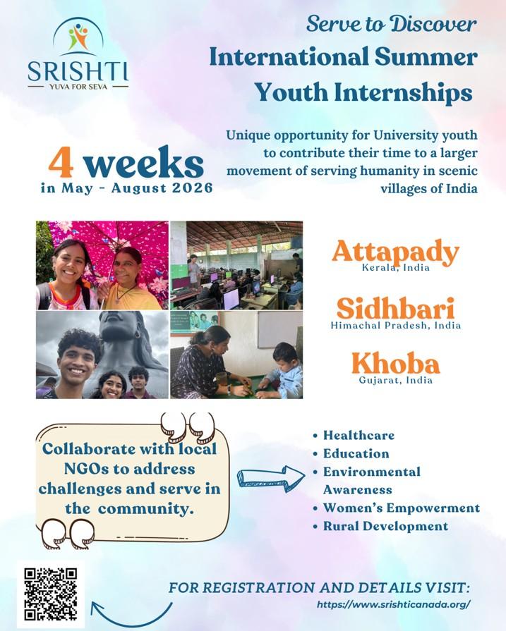 Srishti Foundation – Canada is offering International Youth internships during the summer of 2026, in 3 locations across India.